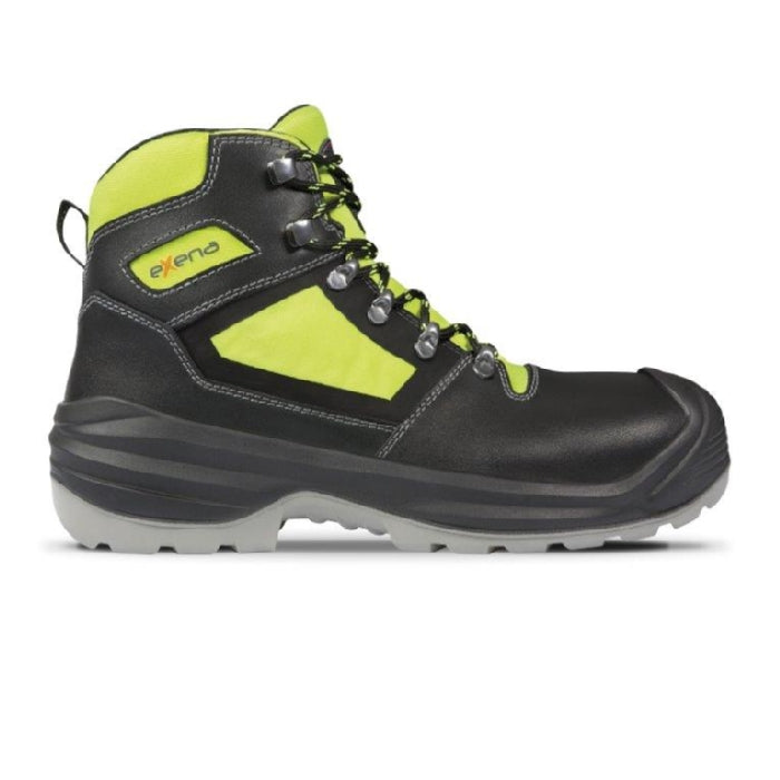 Stivaletto nero in pelle liscia con inserti gialli ad alta visibilità. Puntale T-Wide, sintetico, amagnetico e a calzata ampia, con inserto antiperforazione SafeFlex non metallico. Suola a due strati, uno in poliuretano (PU) e uno in gomma resistente al calore da contatto, con inserto frontale Spunterbo