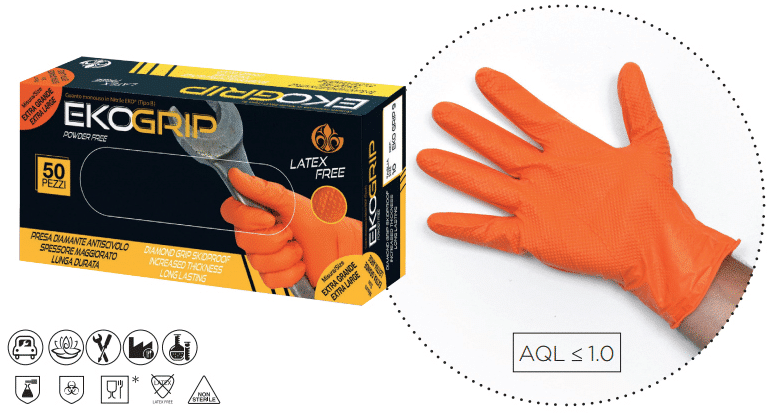 I guanti monouso EKO Grip in nitrile hanno l'interno non impolverato, ideali per pelli sensibili. Garantiscono la massima aderenza grazie alla superficie con texture a diamante antiscivolo "Skidproof", forniscono alte resistenze meccaniche grazie allo spessore maggiorato, protezione da rischi chimici e biologici. La particolare superficie di questi guanti assicura una presa ottimale in ogni condizione di utilizzo e grande sensibilità, dotati di bordino anti arrotolamento.